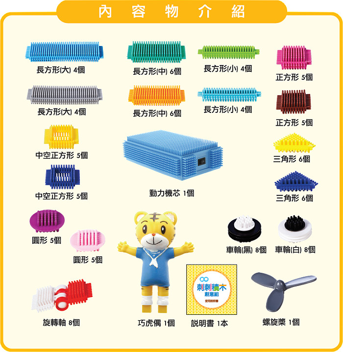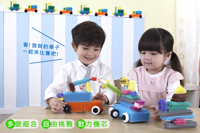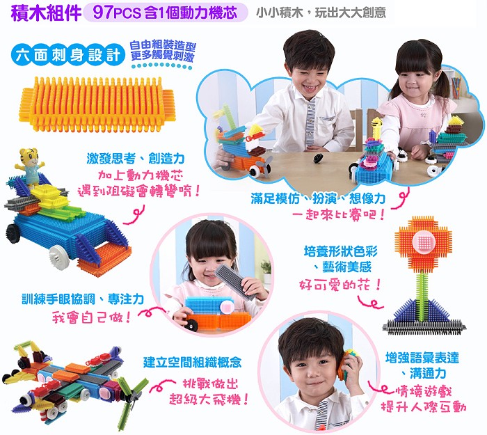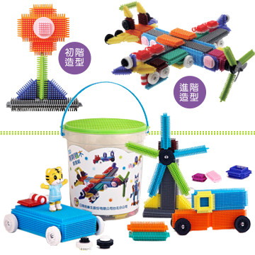 各式形狀組件,可做出動物、植物、房子、汽車和飛機等多樣造型,透過組裝建立孩子空間組織及立體方位的概念,更能培養孩子對形狀、顏色配對造型的藝術美感。