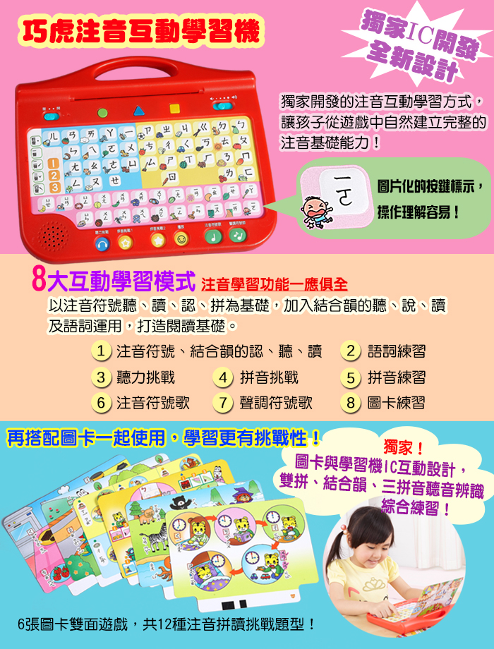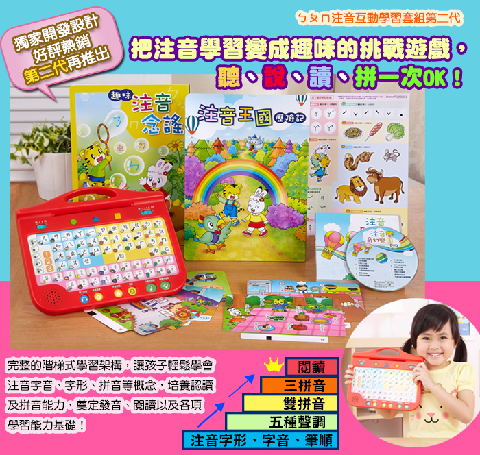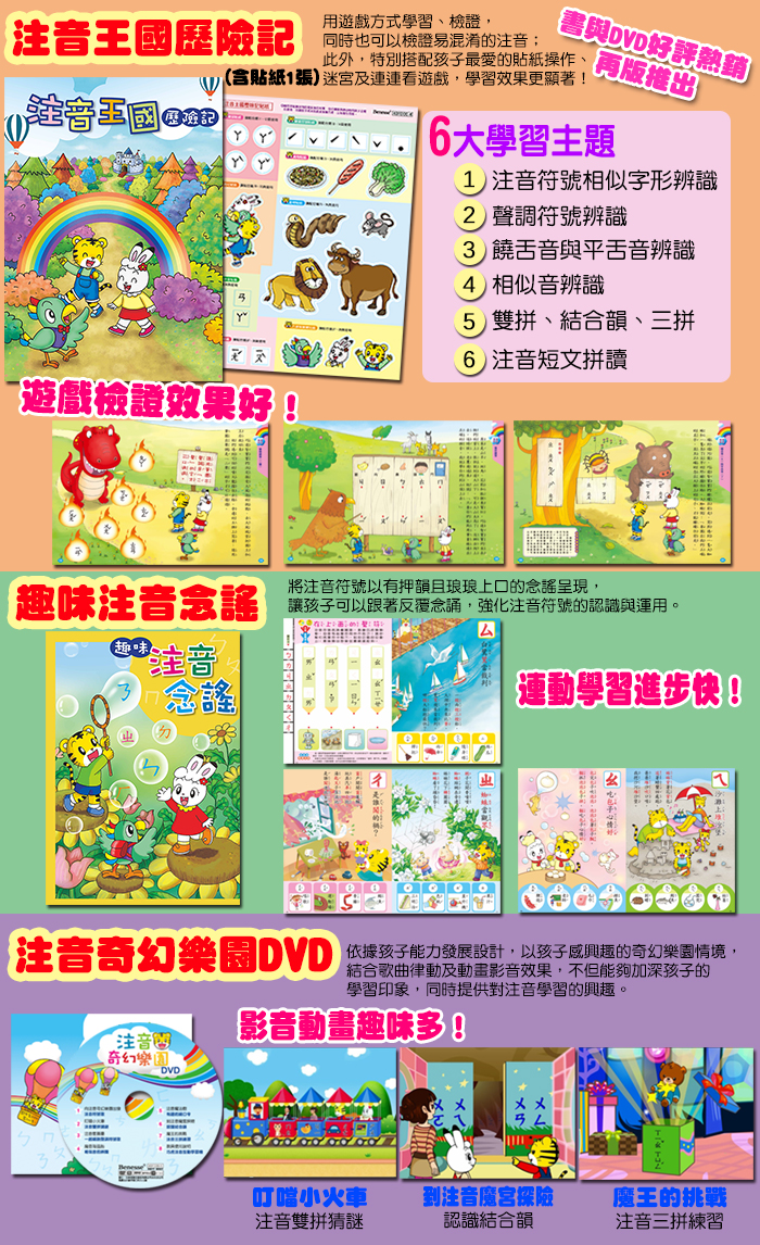 ※「注音王國歷險記」、「趣味注音念謠」及「注音奇幻樂園DVD」是針對第一代注音互動學習套組,部分做微幅改編再版商品。