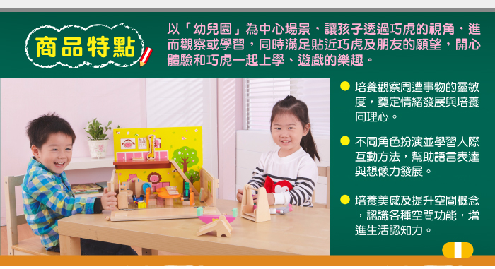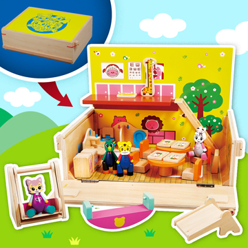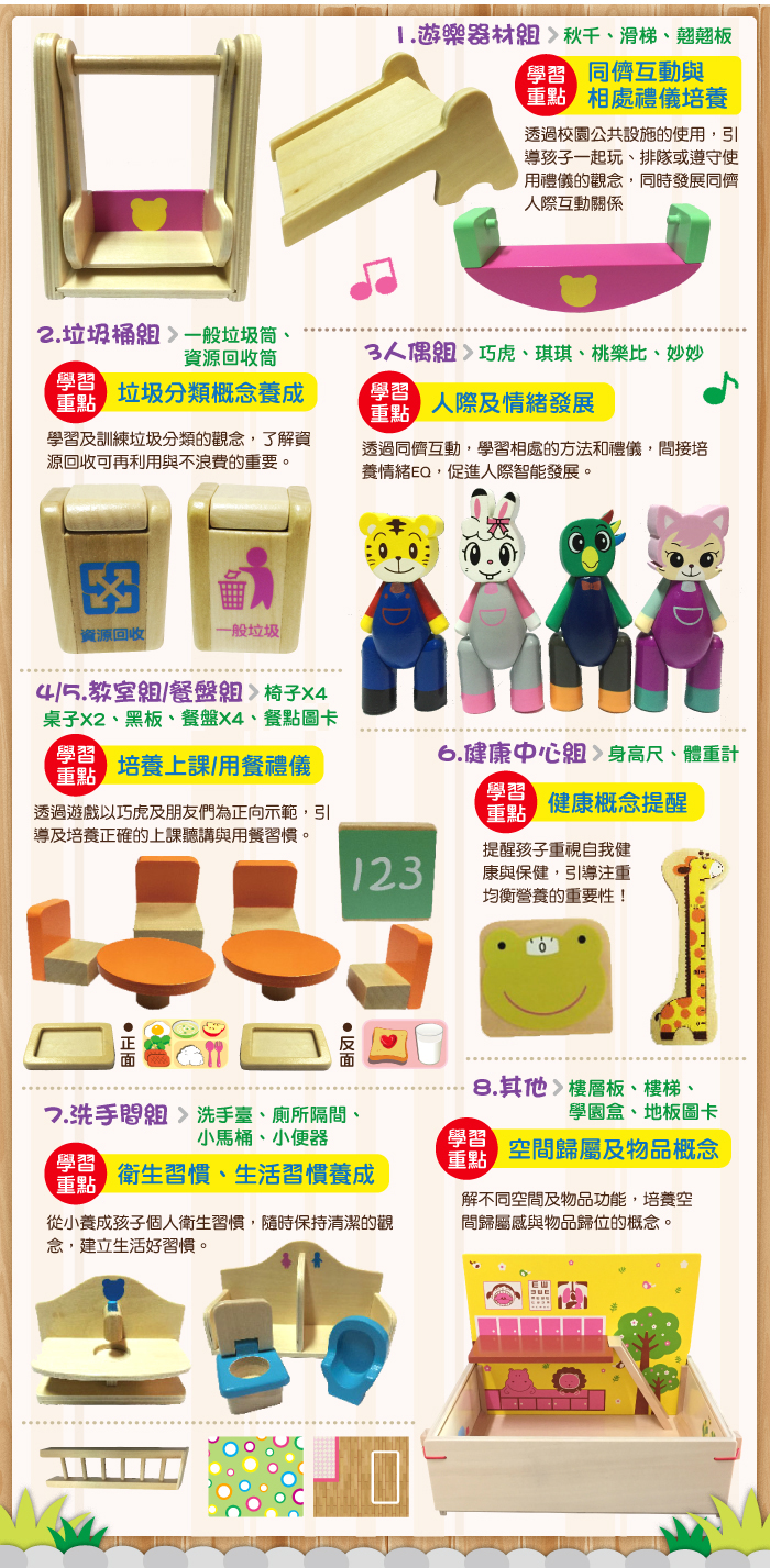 ■內容物:椅子*4、桌子*2、黑板、身高尺、體重計、洗手臺、廁所隔間、小馬桶、小便器、秋千、滑梯、翹翹板、一般垃圾筒、資源回收筒、巧虎人偶、琪琪人偶、桃樂比人偶、妙妙人偶、餐盤*4、餐點圖卡、樓層板、樓梯、學園盒、地板圖卡