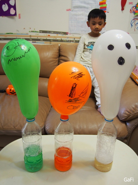 只見南瓜臉氣球越來越大,寶特瓶中的發泡效果開始慢慢減少了~