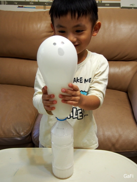 接下來,我請阿鼓將氣球中的小蘇打粉通通灑入寶特瓶中!