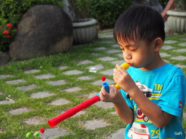 發射! 阿鼓就這樣玩了許久,一玩再玩,玩得很開心! 手把往上當裝填子彈用時,要提醒小朋友用手將上方水管開口處擋住,子彈才不會往上噴出~ 不過,從上方射出子彈也滿有趣的啦! XD
