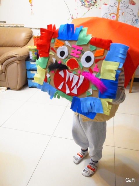 將將! 舞獅臉完成了! 除了擠保利龍膠時阿鼓會有些費力~媽咪我會稍微幫忙之外~ 其他拼貼佈置幾乎都是阿鼓自己完成的哦! 媽媽我再使用雙面膠帶將大片紅色不織布和紙箱做黏貼~ 建議~還是要用熱熔膠比較牢固,貓兒打算再做補強,不然玩一玩,披風很快就脫落嚕! 當然~單用紙箱當面具也很好玩囉!