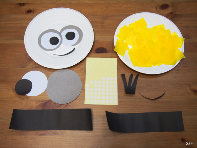 準備材料很簡單! * 紙盤數個 * 黃色宣紙或棉紙 * 色紙: 準備灰色、黑色、白色 * 白色小圓貼紙 (購於文具店) * 剪刀、白膠和水彩筆